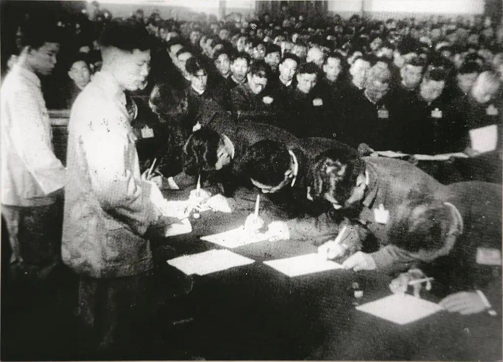 1956年6月21日,最高人民检察院检察员宣读免予起诉决定书后,被免予起诉的日本战犯签字接收。(此照片展览于抚顺战犯管理所陈列馆)