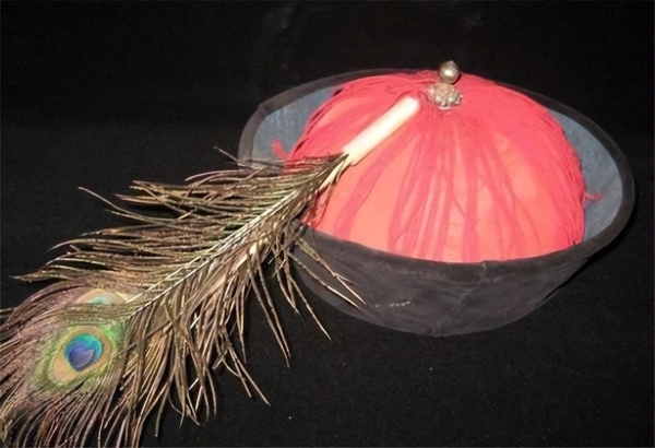 清朝官帽的顶珠,视官员的品级,是用各种不同的宝石制作而成,比如一品官用的是红宝石,二品官用的是珊瑚,三品官用的是蓝宝石等等。顶珠的下面是翎管,用来插各种材质的花翎或者蓝翎。